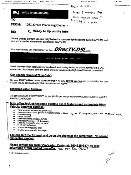 We found this at http://directvdsl.com/why/compare.asp, which includes a number of the free inclusions seen in the fax; it's also in .pdf format at http://NewsoftheStoopid.com/compare.pdf in case DirecTV change their offer in the near future.